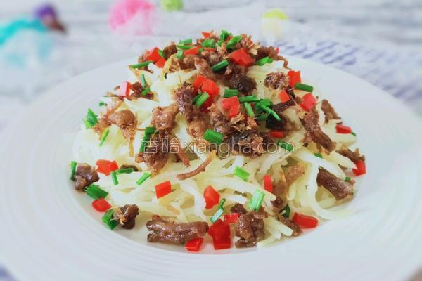 415072浏览 / 27收藏 健康功效 土豆:活血化瘀 食材用料 油滋了 35克 葱花 3克 红辣椒末 10克 盐 适量 鸡精 适量 油滋了土豆丝的做法1.成品图。2.土豆去死洗净,用插板插成丝。3.切葱花,辣椒末。4.土豆丝加入盐,鸡精,面粉拌匀。5.锅水烧开,放入土豆丝大火蒸5分钟。6.时间到,取出土豆丝,将油滋了撒在土豆丝表面,在撒上红辣椒末。7.最后撒上葱花即可。 小贴士油滋了提前热一下,控掉多余油份。 本菜谱由上传...
