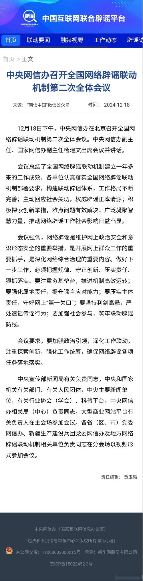 来源:网信北京   作者:   2025-04-10 15:23:06   4月10日上午,北京市委网信办召开全市网络辟谣联动机制第二次全体会议。会议通报了2024年全市网络辟谣联动机制工作情况、依法处置造谣传谣账号和平台典型案例以及网络谣言治理工作情况,市公安局、市卫健委主责处室负责同志,昌平、大兴、延庆区委网信办负责同志以及微博、抖音相关负责人作交流发言。   会议总结了全市网络辟谣联动机制建立一年来的工作成效。各单位认真落实全市网络辟谣联动机制部署要求,把准舆论导向,网络意识形态阵地更加扎实筑牢;护航企业发展,营商网络环境更加向善向好;主动回应关切,网上群众路...