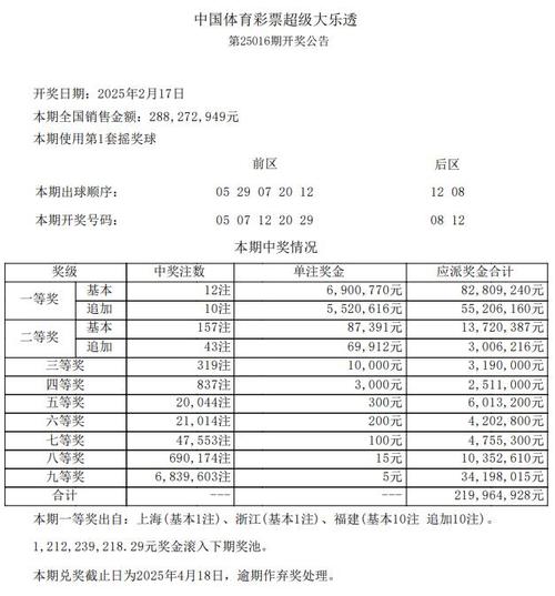 北京时间2月17日晚,体彩大乐透第25016期开奖,当期开奖号码为:前区05 07 12 20 29,后区08 12。本期全国共开出12注一等奖,单注奖金690万余元,其中10注选择追加,多得奖金552万余元,单注追加头奖达到1242万余元。经新浪彩票确认,本期福建中出的10注追加头奖中有9注出自福建省泉州市第3505015535号体彩销售网点,揽得1.11亿元巨奖!【中奖喜报-新浪小炮专家预测中大乐透790万!】   相关阅读-国内82个亿元奖回顾:福建泉州大乐透1.11亿排名65、国内30个大乐透亿元奖排行:福建泉州1.11亿第27、福建又爆大乐透1.11亿巨奖 两次奖号神相似?...