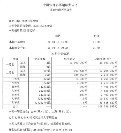 北京时间7月30日晚,体彩大乐透第25086期开奖,当期开奖号码为前区02 06 23 24 33,后区01 10。   本期全国共开出2注一等奖,单注奖金1000万元,分落江苏、山东。二等奖开出45注,单注奖金37.9万余元,其中10注采用追加投注,每注多得奖金30.3万余元。值得注意的是,37.9万是2025年至今第3高的二等单注奖金,仅低于第079期的38.7万,以及第003期的38.5万,详情见下表:   本期全国销量为2.95亿元,奖池方面,16.46亿余元滚存至8月2日(周六)开奖的第25087期。   当晚其他玩法开奖号码为:   福彩3D第25201...