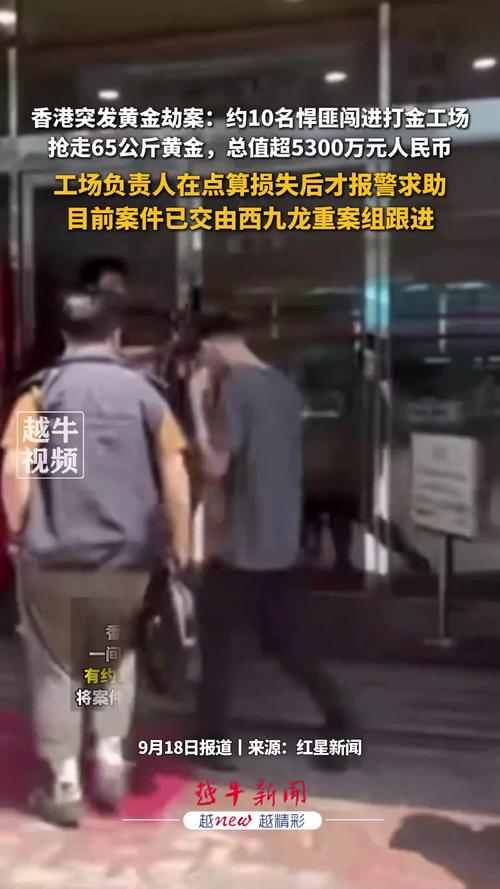 9月17日,香港九龙红磡鹤园东街1号富恒工业大厦的一间打金工场发生了一起黄金劫案。当天上午11时22分,该工场的职员报案称清晨5时许有约10名匪徒闯入。警方到场后将案件列为盗窃案,并追缉多名涉案男子。   案发时,报案人与五名友人在工场内吃饭及休息,未注意到大门是否锁上。突然,约10名男子闯入抢劫,进入专门存放黄金的房间,掠走了65公斤的金条、金砖及金粉,总值约5800万港币(约合人民币5302万元)。此外,窃贼还偷走了约3万元港币现金(约合人民币2.7万元)。   得手后,匪徒将所有在场人士赶离工场,用铁链锁上大门后逃逸,事件中无人受伤。警方已查看监控搜证,了解是否拍下匪徒容...