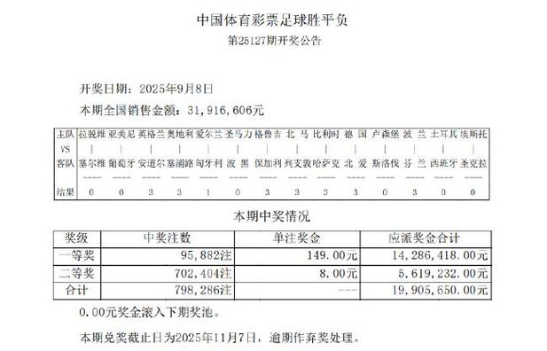 北京时间9月8日,胜负彩第25127期开奖结果揭晓。本期一等奖开出95,882注,单注奖金149元。由于本期足彩正路多达13场,1.3以下的低赔高达10场。最终,足彩一等奖和任九均开出火锅奖,足彩头奖单注奖金仅开出149元,在足彩历史火锅奖排行榜上排名第2位!   二等奖爆出702,404注,单注奖金仅8元;任九开出1,737,785注,单注奖金3元。任九单注奖金仅开3元,仅次于16046期和21033期开出的理论最低奖金2元,排名历史第3低!本期足彩销量为31,916,606元,任九投注总额为10,256,244元。   彩果方面,世欧预赛场仅爱尔兰2-2匈牙利打出3倍冷平,...