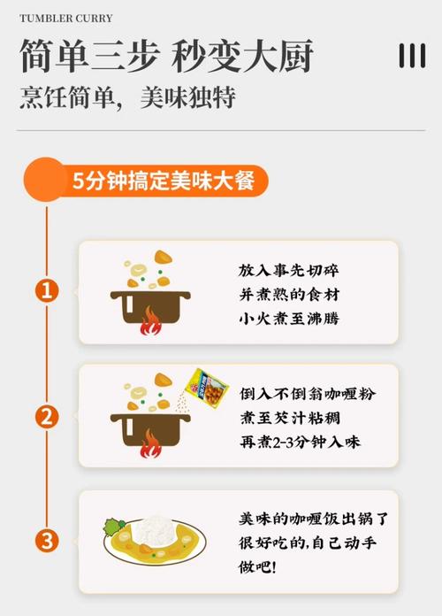 不倒翁咖喱粉使用方法?(图片来源网络,侵删) 不倒翁咖喱粉使用方法?不倒翁咖喱粉的使用方法 土豆丁,肉丁,洋葱丁,胡萝卜丁用食用油炒半熟的时候添水, 等水开后再把咖喱粉用水稀释后添入锅中,在煮3-5分就OK啦,拌米饭超好吃哦~ 同样方法也可以做咖喱面呢。咖喱面条的神仙吃法?回答如下:1. 咖喱面条煮熟后,加入切碎的烤鸡肉或者煮熟的鸡胸肉,搅拌均匀。2. 在另一个锅中,用橄榄油炒香蒜末和洋葱,加入切碎的番茄和一罐椰浆,煮沸后加入咖喱粉调味。3. 将咖喱酱汁倒入面条中,再加入切碎的芹菜和青椒,搅拌均匀。4. 最后再撒上一些芝士粉和香菜就可以了。神仙吃法是将咖喱面条放入一个大碗中,用勺子翻动拌匀,...