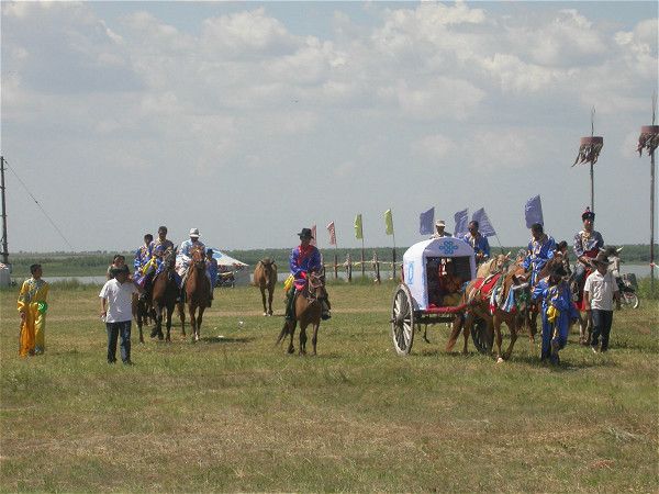 赞歌一首接一首,一直唱到“求骨宴”女席间的女主人们认为满意为止,这时才把“沙嘎”用布包好交给新郎。新郎拿到“沙嘎”这才放心,标志着接亲成功。接着便将新娘请入哈日特热格或乘白马,返回家乡。当新娘即将离开家娘时,女方的歌手们唱道: