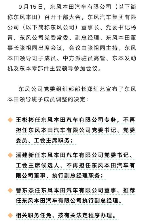 凤凰网科技讯 9月16日,据东风汽车官方消息,东风本田汽车有限公司领导班子成员调整,王彬彬任东风本田汽车有限公司专务,不再担任东风本田汽车有限公司党委书记、党委委员、工会主席职务;   潘建新任东风本田汽车有限公司党委书记、工会主席候选人,不再担任东风本田汽车有限公司董事、执行副总经理职务;   曹东杰任东风本田汽车有限公司董事,推荐任东风本田汽车有限公司执行副总经理。相关职务任免,按有关法定程序办理。   相关资料显示,曹东杰是一位“老东风人”,此前曾在东风本田担任制造、品质、技术、采购等领域管理工作,后又在东风乘用车、东风猛士科技等板块担任相关职务,具备丰富的汽车行业...