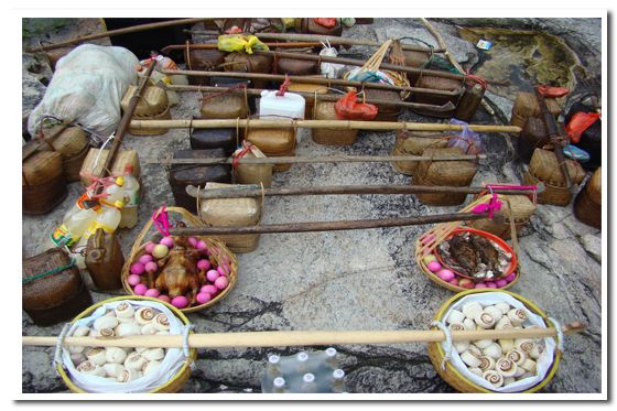 每年秋收后的农历九至十一月间,是湘西苗族忙碌的接亲嫁女季节。这里的苗族婚礼,有着浓郁、古朴的民族特点。 去接亲之前,由“新郎”的舅舅亲手以彩色布装饰迎亲轿子,称为“围轿”,并请“端公”(武教)用大磨一扇、斗和升一个放在家中神龛前,化纸焚香,祈祷收邪把誓。由身着青布的“新郎”披红,拜家神后便“发担”接亲。“发担”即是派人挑着酒、肉及其他物品先走,接亲队紧接上路。接亲队备有灯笼4盏,红旗几面。接亲队除“新郎”外,另有年龄小于“新郎”的侄辈少年负责背两个包裹,内装送予“新娘”的服装及首饰。接亲队伍一路吹着唢呐,热热闹闹到女方家迎娶“新娘”。 车到婆家 姑娘出嫁必须有娘家人陪送,婚礼这...