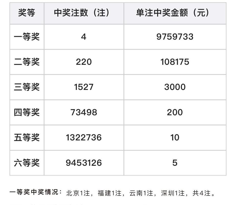 北京时间7月30日晚,体彩大乐透第25086期开奖,当期开奖号码为前区02 06 23 24 33,后区01 10。   本期全国共开出2注一等奖,单注奖金1000万元,分落江苏、山东。二等奖开出45注,单注奖金37.9万余元,其中10注采用追加投注,每注多得奖金30.3万余元。值得注意的是,37.9万是2025年至今第3高的二等单注奖金,仅低于第079期的38.7万,以及第003期的38.5万,详情见下表:   本期全国销量为2.95亿元,奖池方面,16.46亿余元滚存至8月2日(周六)开奖的第25087期。   当晚其他玩法开奖号码为:   福彩3D第25201...