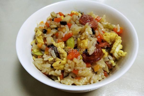 5232浏览 / 12收藏 健康功效 大米:低钙、低钾、低钠 鸡蛋:润燥 食材用料 菜心 一小把 水 800g 生抽 适量 蒸鱼豉油 适量 腊肠饭的做法1.我用泰国香米。这个没特别要求。米洗一下。水是米的1.5倍。盖上锅盖开高火2.腊肠。最好有肥肉的。3.腊肠切片。生姜切碎。4.大概十几分钟水快干了撒上腊肠和姜末。盖上盖子开小火5.生抽+蒸鱼豉油+冰糖。放微波炉加热一下。冰糖让它化开。市面上有卖煲仔饭汁。我觉得有点咸,自己调的好吃一点。看个人喜好啦。但是都最好要加热一下哦。6.不能没有蛋!7.菜心浸泡冲洗干净。我习惯炒一下。也可以焯水一下,反正让它断生就好了。8.家里有小盆友所以锅巴怕拌...